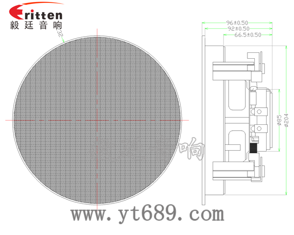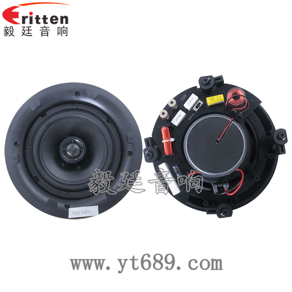 此款6.5寸天花吸頂喇叭,頂級元件±3dB分頻器,可完美的控制揚聲器的中、高、低音,對角四個可旋轉卡扣柱,用于天花喇叭倒掛方式安裝,方便牢固,頻響寬,失真小,信噪比好。