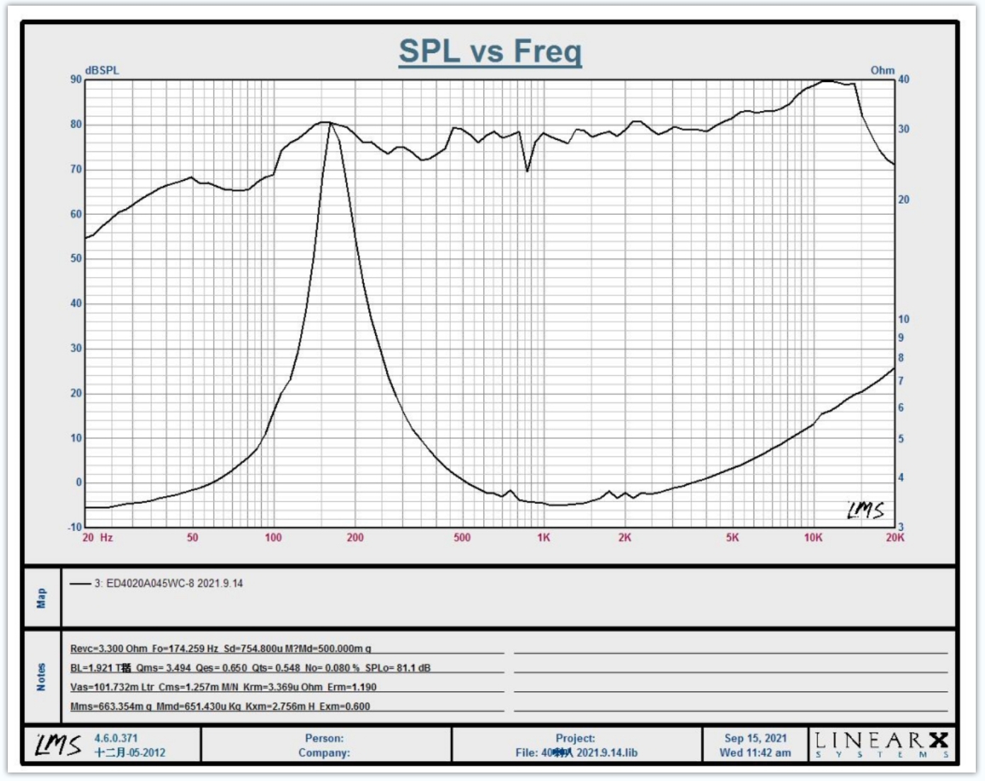 它顯示喇叭在不同頻率下的電阻變化情況(以歐姆為單位)。阻抗在諧振頻率(Fs)附近會出現一個峰值,然后趨于平穩。