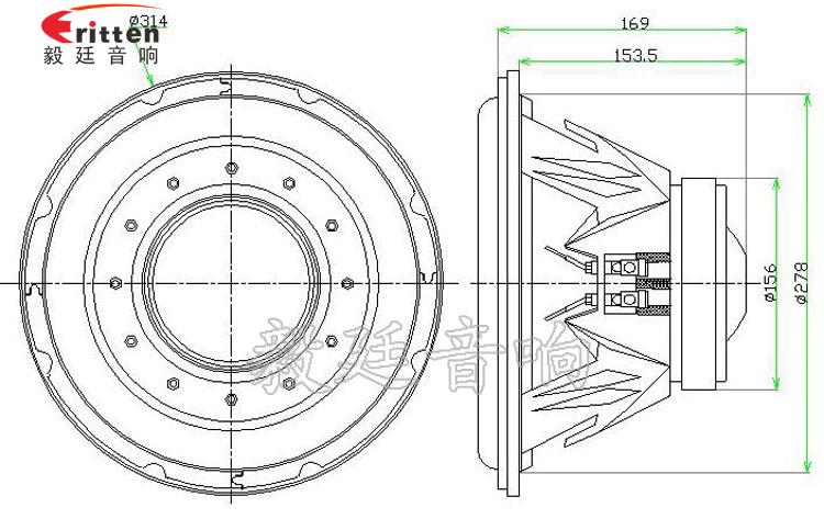 12寸圓型鋁盆架外磁重低音喇叭,采用的是高性能鐵氧體,音質清晰,性能穩定;